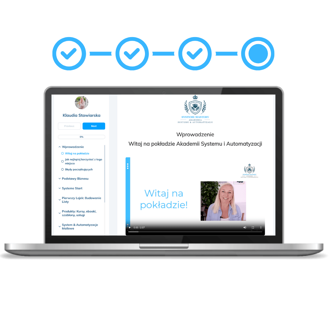 Akademia Systemu i Automatyzacji to platforma, w której uczysz się techniki krok po kroku na prostej platformie Systemeio. Widzisz, jak budować: strony, lejki i automatyzacje.