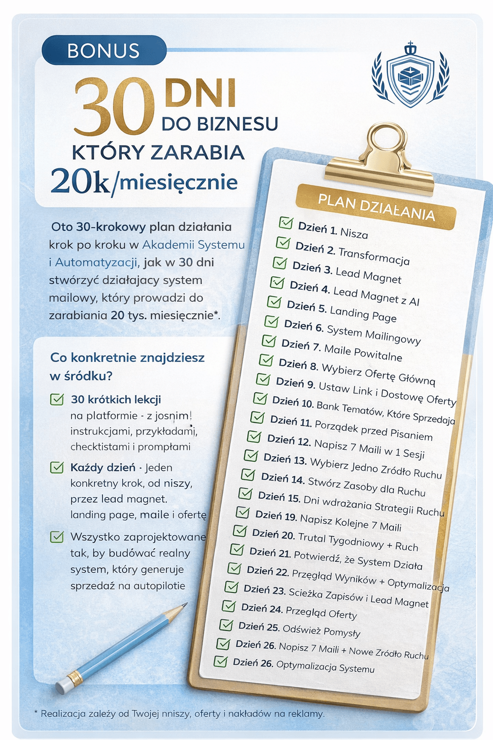 ZASTRZEŻENIE: Prezentowane na stronie efekty oraz przykłady finansowe (np. wzmianki o biznesie 20k/mies.) są wynikami osób, które aktywnie wdrożyły zdobytą wiedzę. Prosimy o zrozumienie, że wyniki te nie są gwarantowane i nie są „typowe” dla każdego uczestnika bez włożenia odpowiedniej pracy. Twoje sukcesy zależą od wielu czynników: Twojego doświadczenia, etyki pracy, rodzaju oferowanego produktu oraz aktualnej sytuacji rynkowej. Akademia Systemu i Automatyzacji dostarcza narzędzi i instrukcji (know-how), ale nie bierze odpowiedzialności za indywidualne wyniki finansowe. Prowadzenie biznesu online wiąże się z ryzykiem i wymaga regularnego działania.
