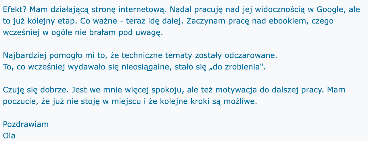 Bez presji, ścigania się w social mediach i zgadywania, co jest kolejnym krokiem. Nareszcie rozumiesz co z czym, po co i jak to zrobić, żeby u Ciebie działało.