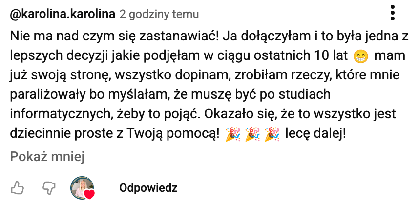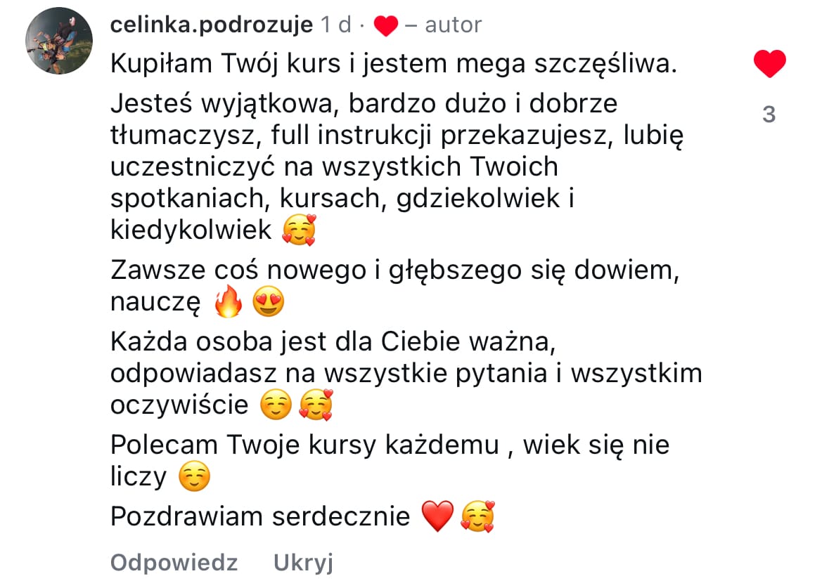 Przeszłam przez niezliczone szkolenia, kursy, coachingi i testowałam dziesiątki narzędzi - wszystko po to, by stworzyć biznes, który nie tylko zarabia, ale pozwala mi cieszyć się swobodą, o jakiej zawsze marzyłam.