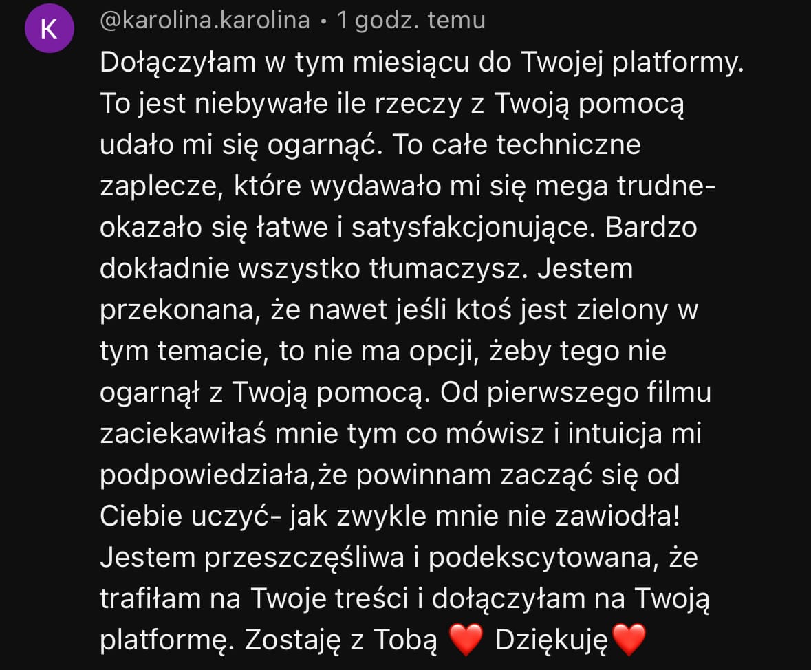 I dokładnie tam to dostajesz: strategie, mindset, marketing, sprzedaż, content, automatyczne lejki i gotowe szablony. Cała moja dotychczasowa wiedza, z 7 lat działania online, skondenwowana w jednym programie.