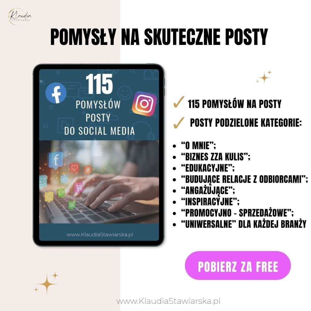 W ebooku spisałam listę 115 sprawdzonych pomysłów na treści, pasujących dla każdej branży i niszy! Dzięki tym pomysłom, zbudujesz lojalną społeczność, wzbudzisz zaufanie do swojej marki i naturalnie zaoferujesz swoje produkty i usługi, bez narzucania się i bez nachalnej sprzedaży!